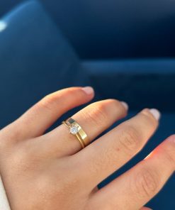É uma aliança com estrutura interna de prata, recoberta por uma chapa de Ouro 10K fixada com tecnologia avançada. Essa técnica proporciona a aparência luxuosa do ouro com uma estrutura resistente e confortável, garantindo maior longevidade e brilho intenso.