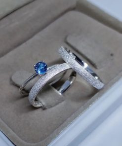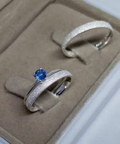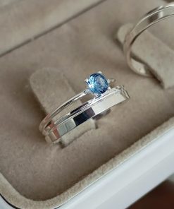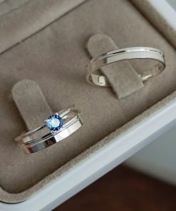 Alianças de Namoro em Prata 950 2mm | Tradicional Liso Redondo | Anel Solitário Azul Incluso
