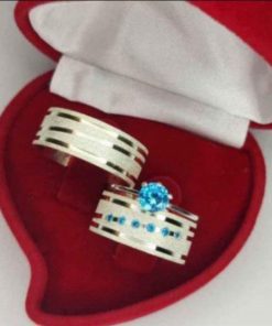 Para complementar o conjunto, há a opção de incluir um anel solitário cravejado com pedra de zircônia azul, agregando ainda mais sofisticação ao modelo.
