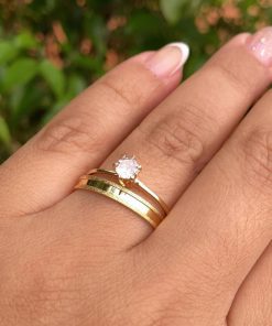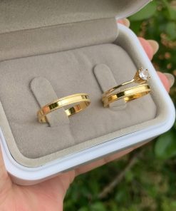 O destaque fica por conta do acabamento todo diamantado e do friso central largo, que adiciona profundidade ao design. Este conjunto acompanha um anel solitário semijoia com acabamento banhado a ouro, perfeito para completar o momento com romantismo e estilo.
