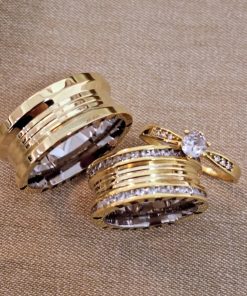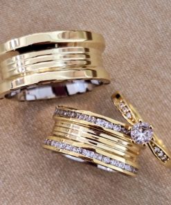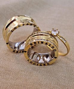 O modelo estilo Bulgari de 10mm é uma escolha sofisticada e imponente para casais que buscam alianças luxuosas e marcantes. Fabricadas em moeda antiga e banhadas a ouro 18k, essas alianças combinam design moderno com alta durabilidade. A aliança feminina possui aproximadamente 60 pedras de zircônia cravejadas, sendo 30 de cada lado, com a quantidade variando conforme o tamanho da peça. O modelo masculino, robusto e elegante, apresenta dois frisos centrais, mantendo o estilo clássico Bulgari. Além disso, oferecemos a opção de gravação a laser e anel solitário incluso para complementar o conjunto.