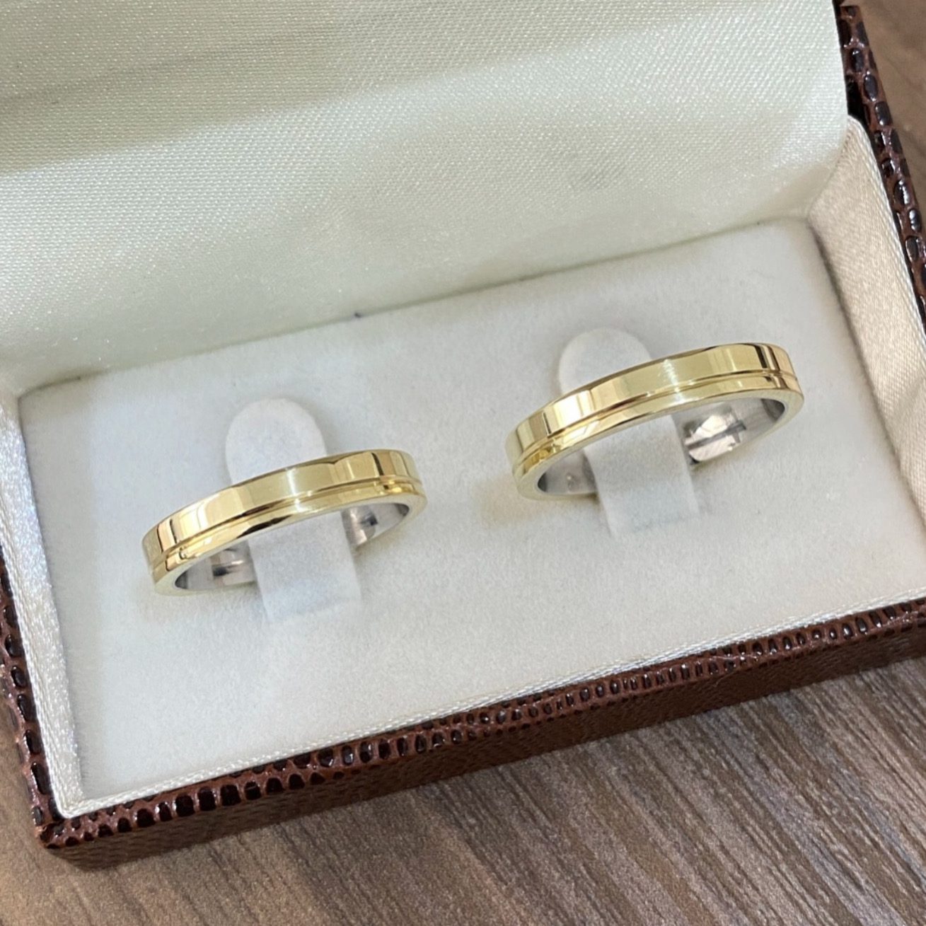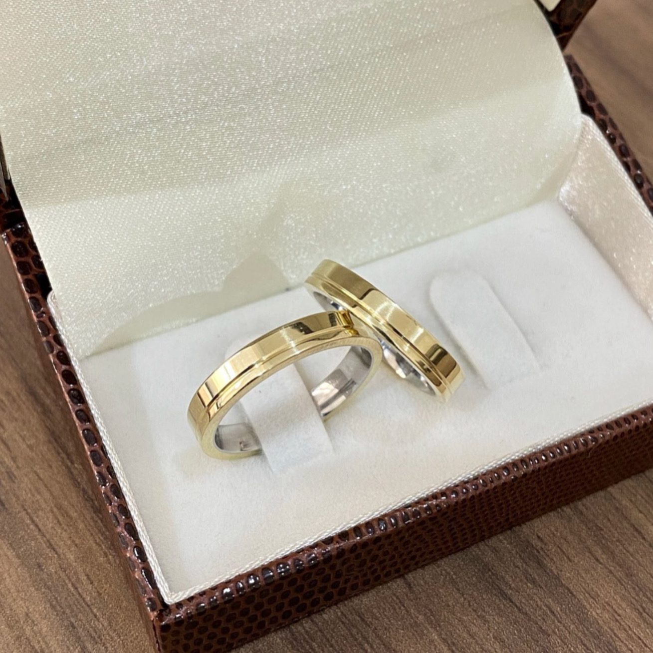 • Par de alianças 4mm modelo com 1 friso lateral.