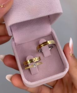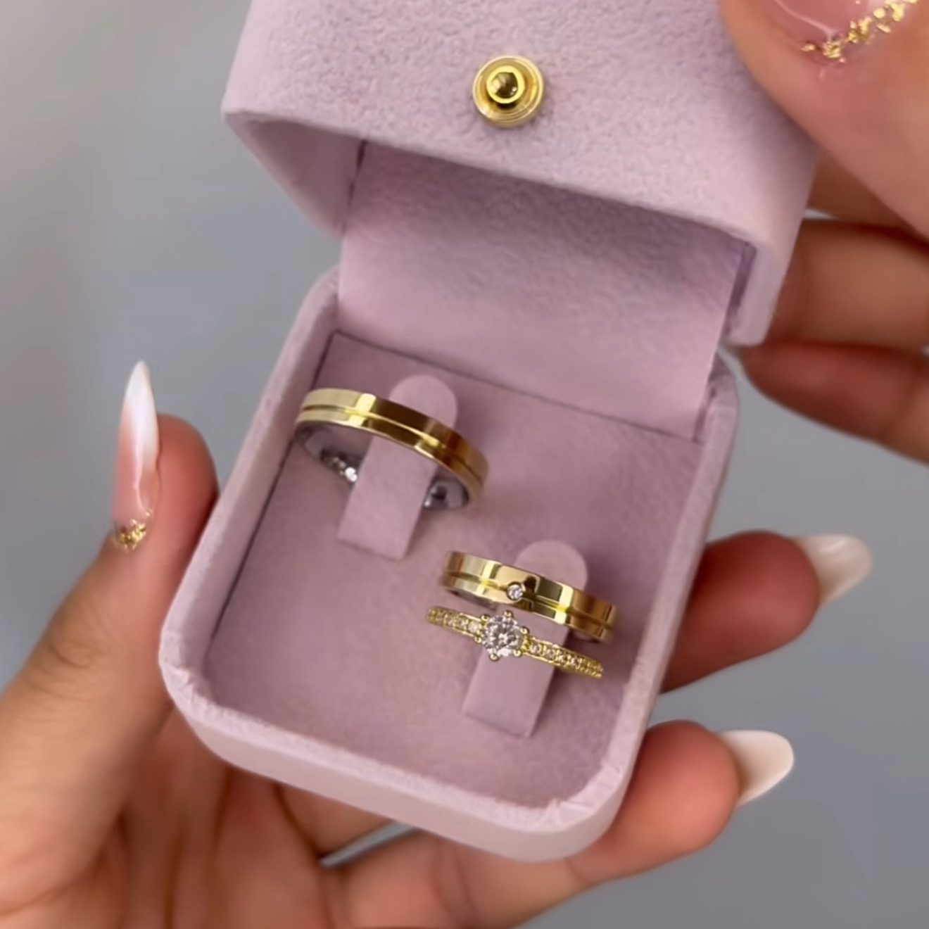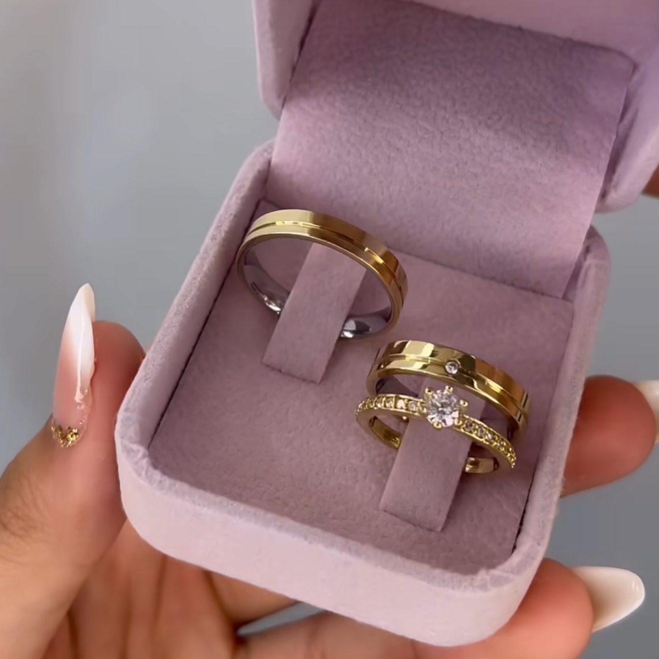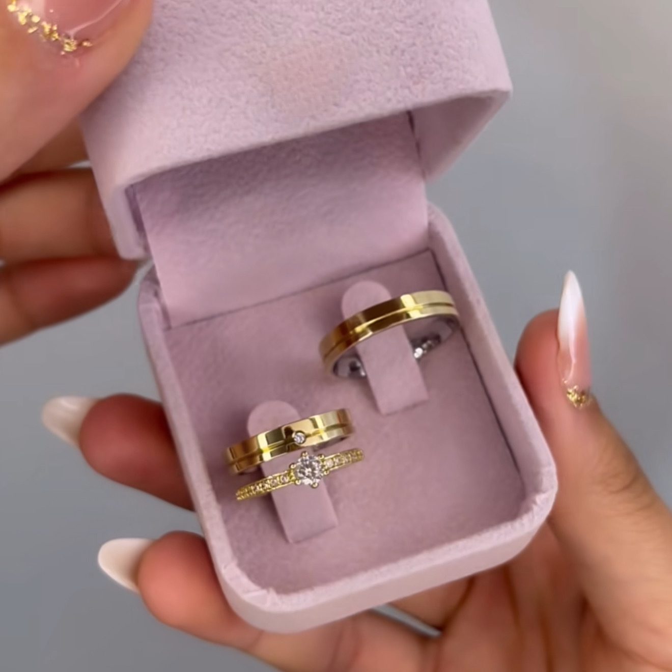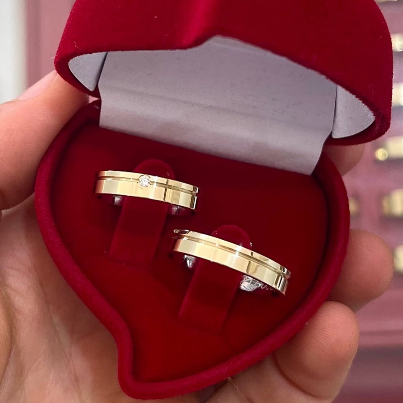A aliança feminina possui 1 pedra de zircônia cravejada, trazendo brilho sutil e romantismo à peça. A masculina segue lisa com friso lateral, mantendo um visual clássico e equilibrado.