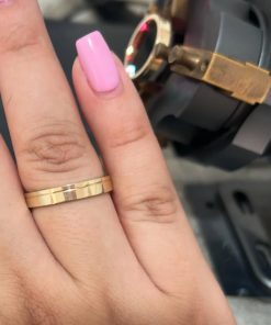 A aliança feminina possui uma pedra de zircônia delicadamente posicionada dentro do friso, acrescentando um charme sutil à peça.