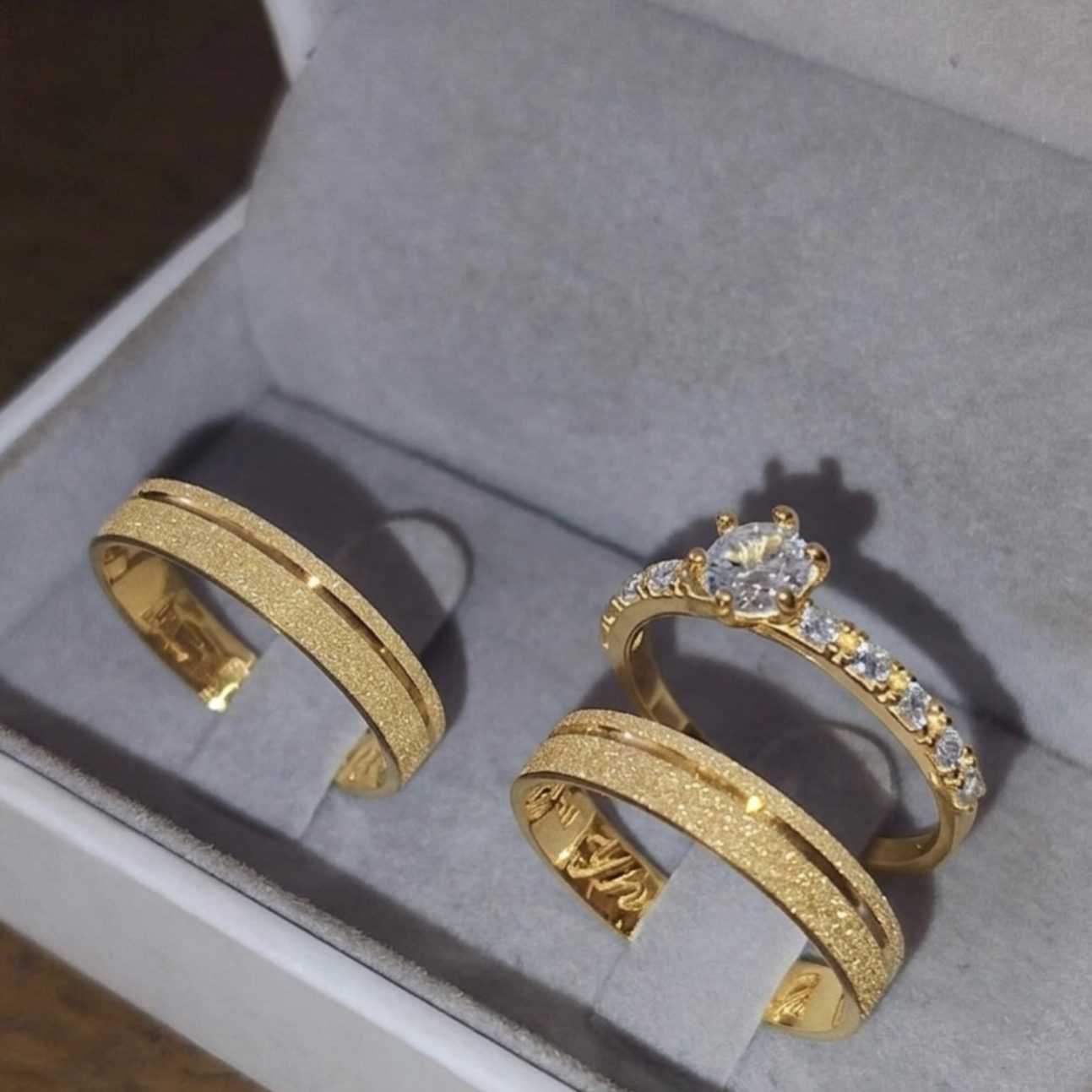 Alianças de Casamento 5mm | Modelo Todo Diamantado com 1 Friso Lateral | Semi Anatômico | Moeda Antiga Banhada a Ouro 18K | Anel Solitário Cravejado Incluso