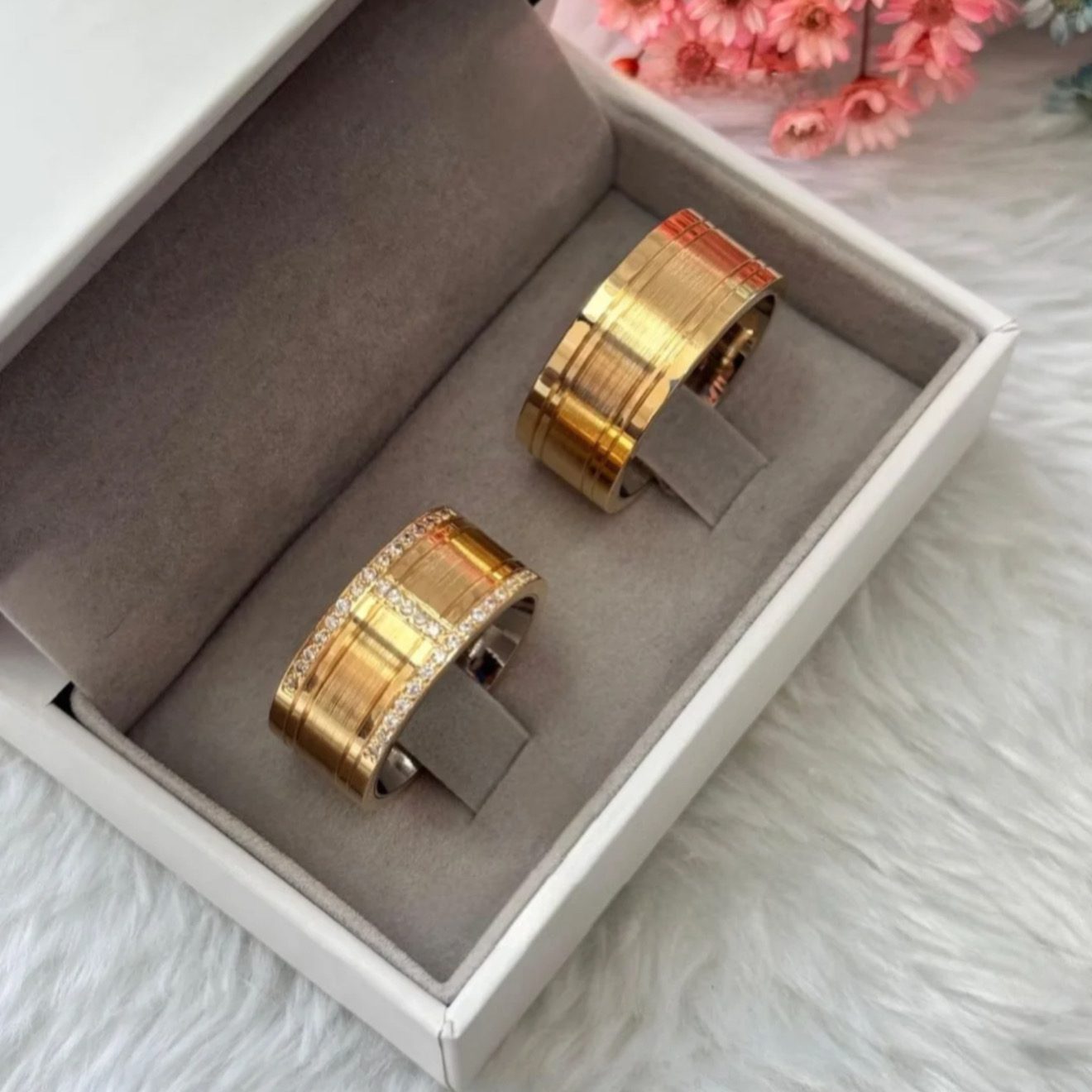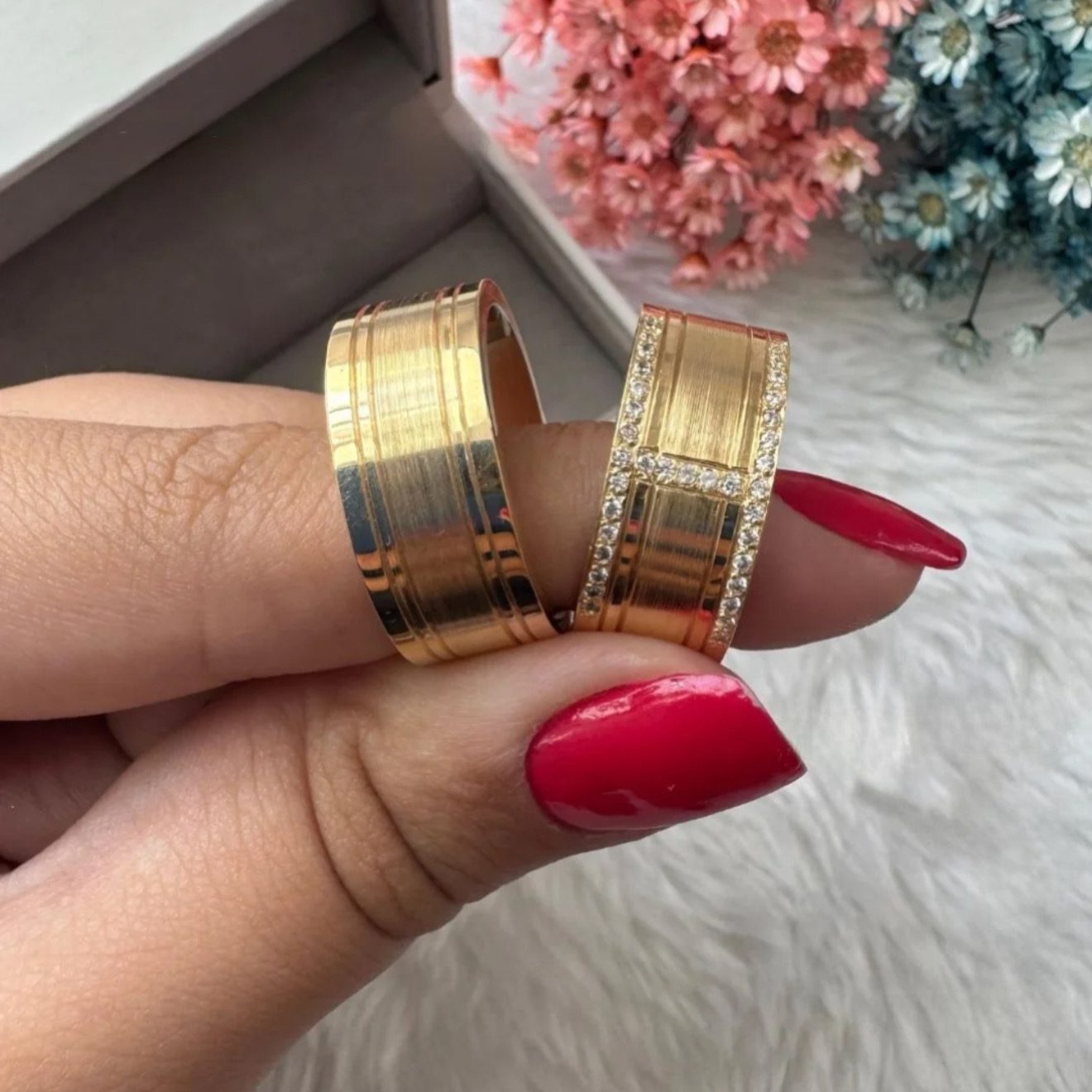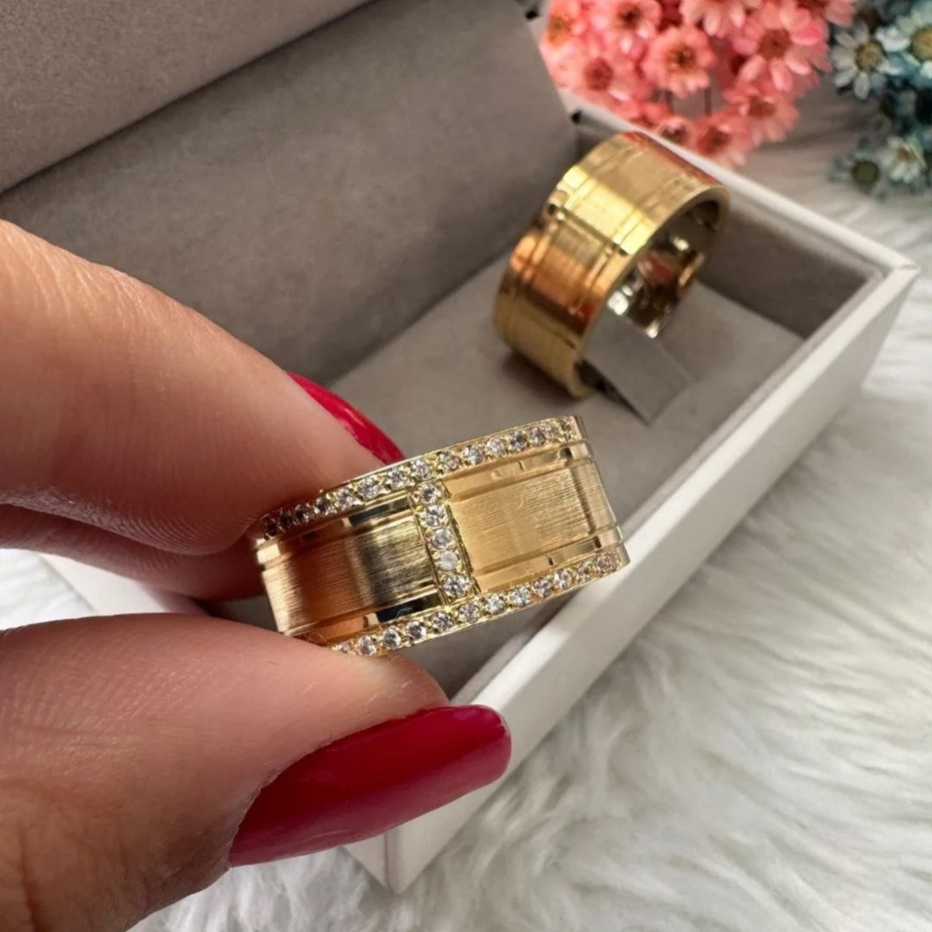 Alianças de Casamento 8mm | Polida com Centro Fosco Diamantado | Moeda Antiga Banhada a Ouro 18K | Feminina com 35 Pedras de Zircônia