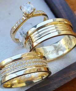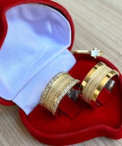 A aliança feminina possui aproximadamente 30 pedras de zircônia cravejadas em meia volta em cada lateral, com a quantidade variando conforme o tamanho da peça. Já a aliança masculina apresenta um design robusto e marcante, com dois frisos centrais que reforçam sua identidade imponente. Além disso, a gravação a laser na lateral é opcional, permitindo uma personalização única e exclusiva.