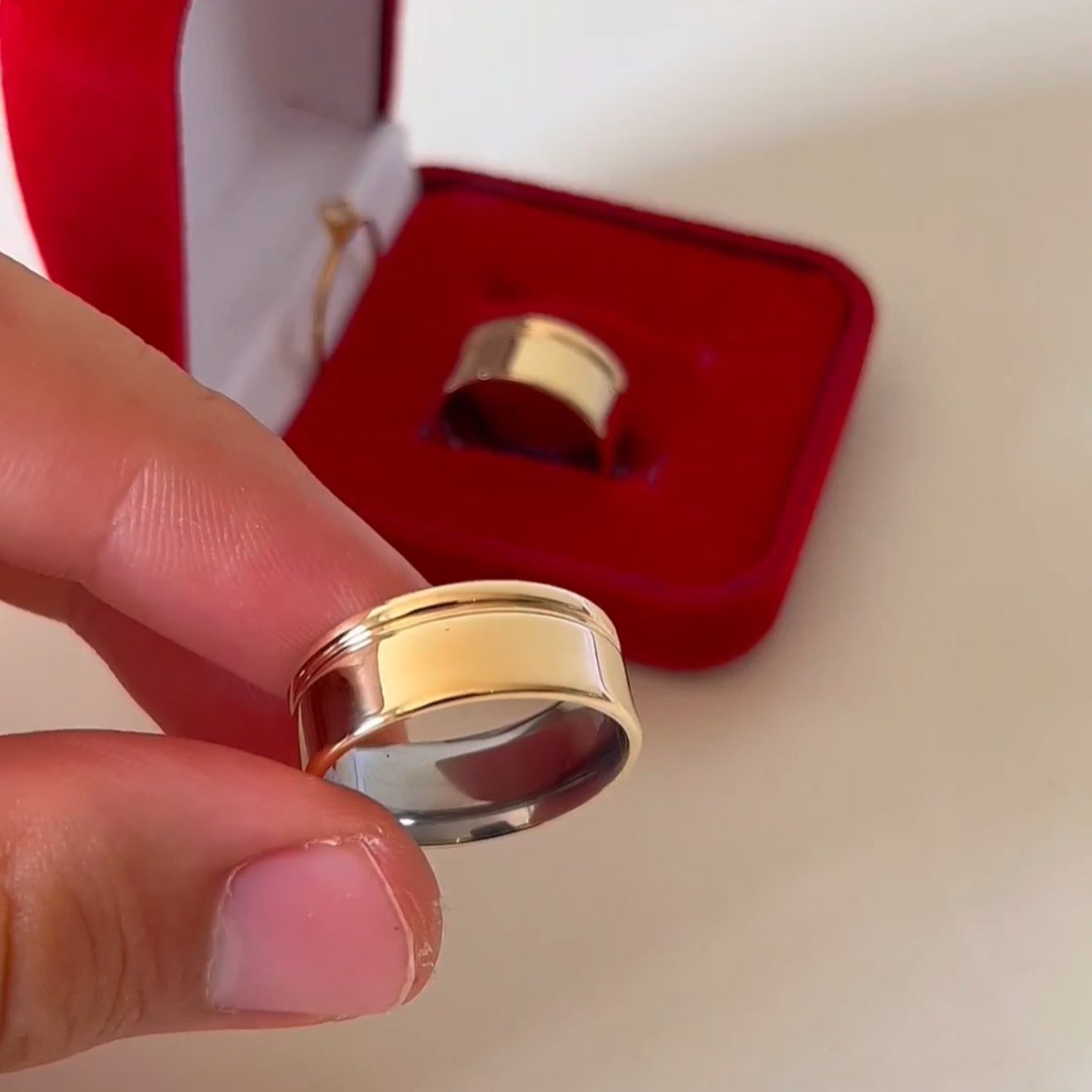 As alianças de casamento ouro 10k com revestimento em aço 8mm são ideais para casais que buscam presença, sofisticação e durabilidade em um modelo marcante.