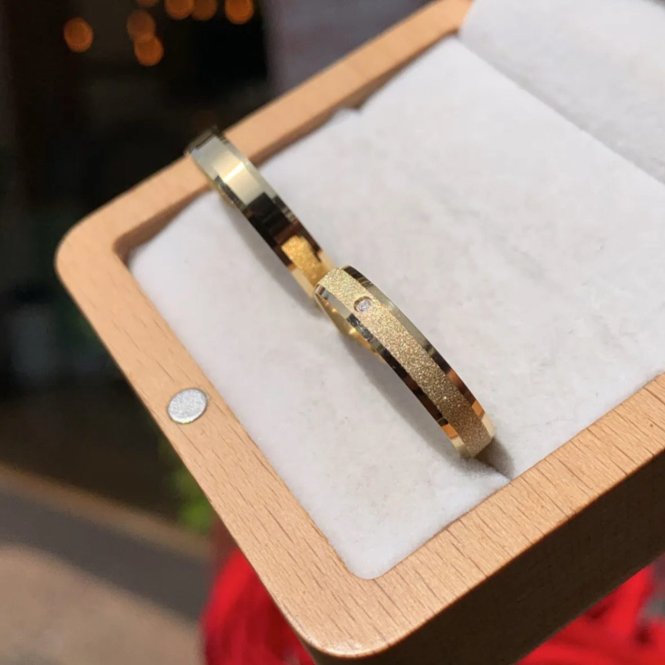 A aliança feminina possui acabamento diamantado com lateral chanfrada, além de uma pedra de zircônia central, proporcionando brilho intenso e delicado. Já a aliança masculina mantém um estilo clássico e elegante, com acabamento liso, criando um contraste harmonioso e sofisticado entre o par.