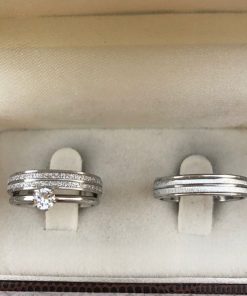 ● Par de alianças em aço cirúrgico prata 4mm – feminina diamantada e masculina lisa fosca.