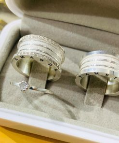 Alianças de Namoro em Prata 950 | 10mm Estilo Bulgari | Anatômicas com 3 Frisos Diamantados | Feminina com 30 Pedras de Zircônia Branca | Anel Solitário Incluso