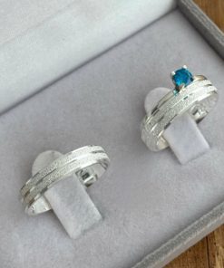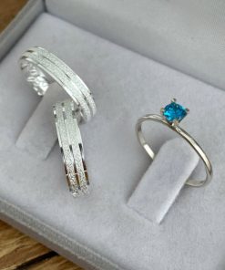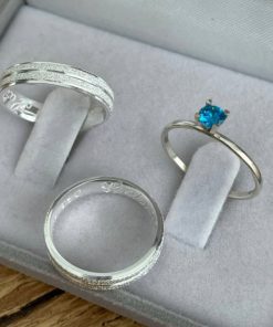 O conjunto acompanha um anel solitário com pedra de zircônia azul, que acrescenta um charme especial e um toque romântico à joia.