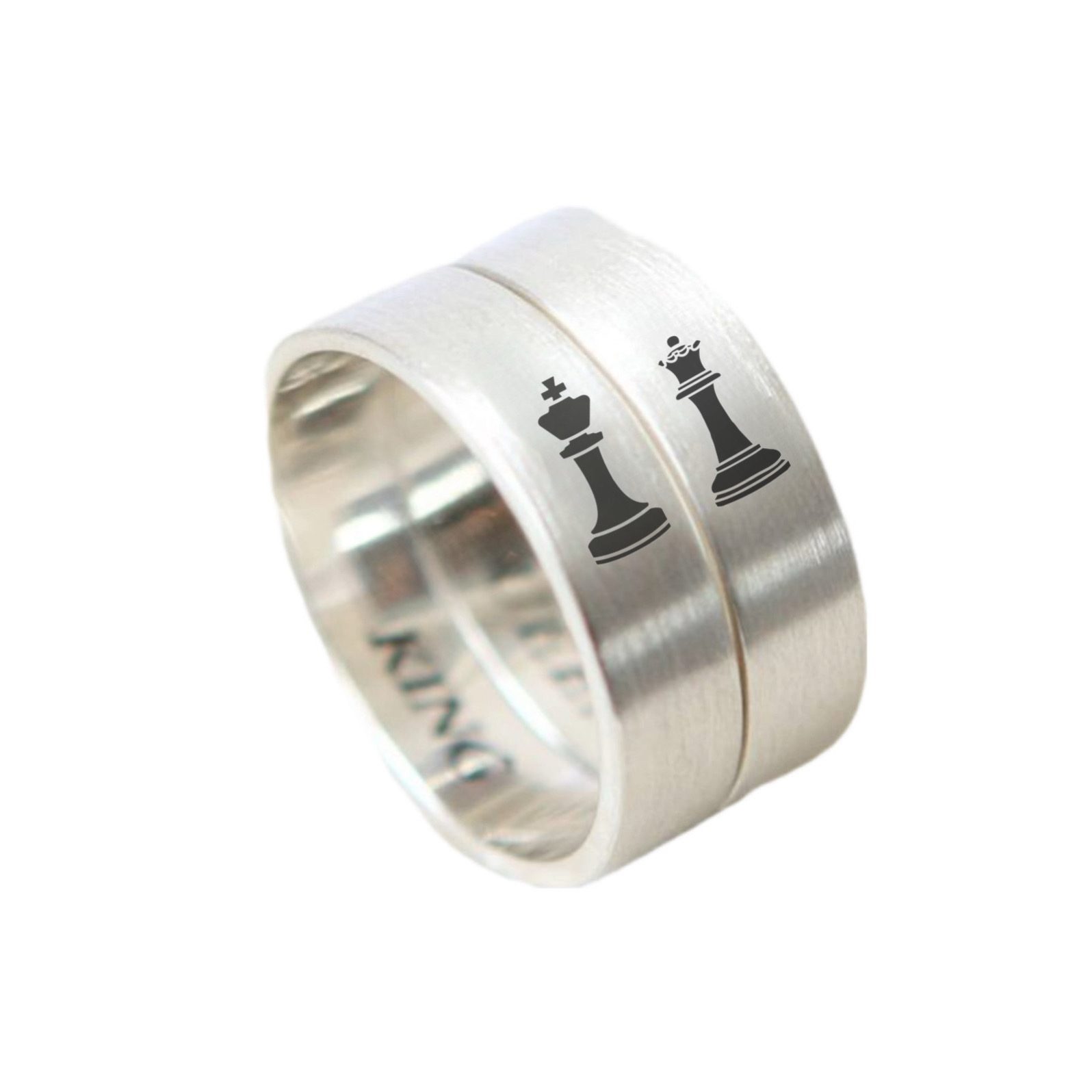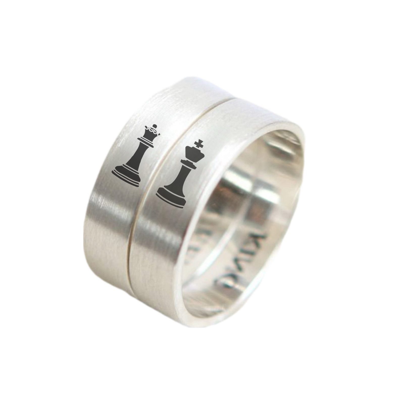 Este modelo de alianças é perfeito para casais que amam estilo, significado e originalidade. Feito em Prata 950, com acabamento liso e foco lixado, traz um toque moderno e elegante para o compromisso. O destaque fica por conta da gravação externa com os desenhos do rei e da rainha do xadrez, simbolizando a parceria e força do casal.