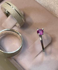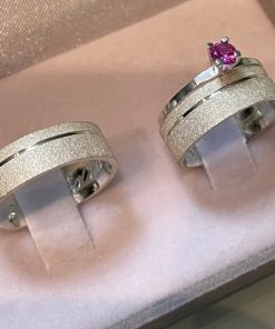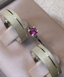 Alianças de Namoro em Prata 950 6mm | Todo Diamantado com 1 Friso Lateral | Semi Anatômicas | Anel Solitário Incluso Cor Vinho