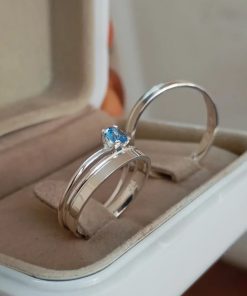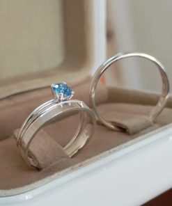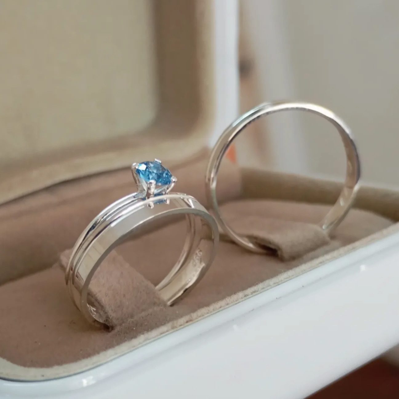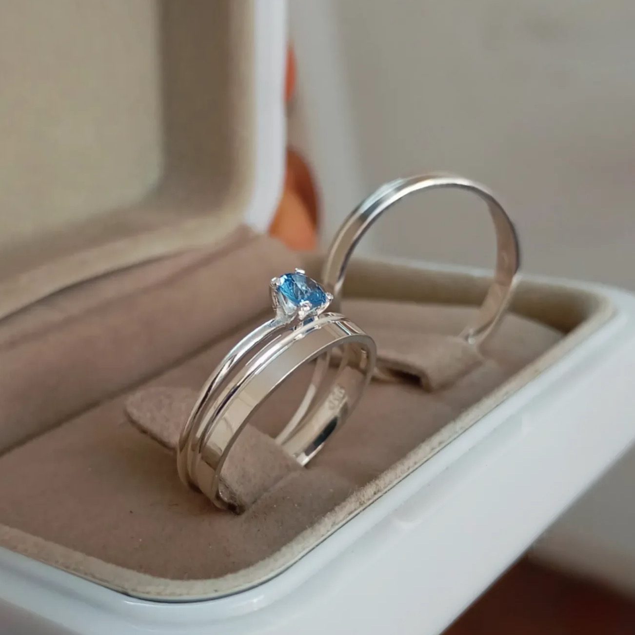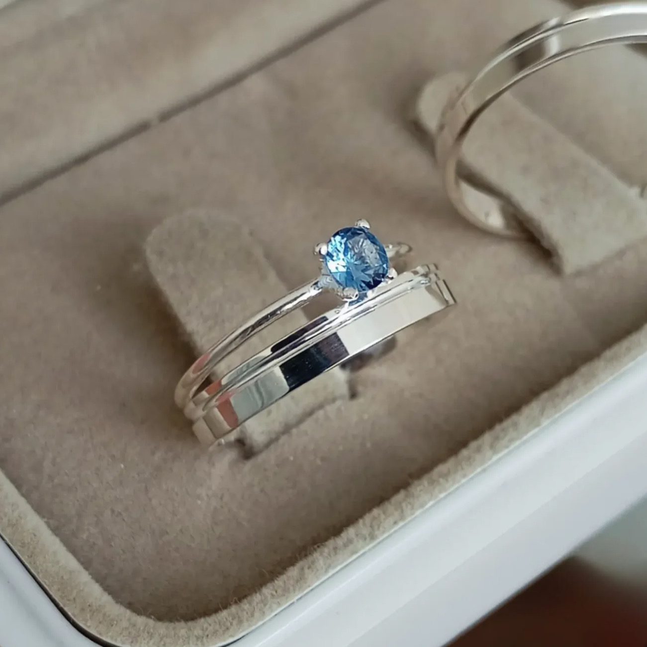 Para complementar o conjunto, há a opção de incluir um anel solitário com pedra de zircônia azul claro, trazendo um toque especial de brilho e romantismo. A tonalidade da pedra pode variar levemente de acordo com a iluminação, tornando cada peça ainda mais única.