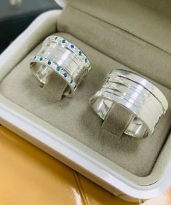 Alianças de Namoro Estilo Bulgari em Prata 950 | Cor Azul e Branca | 10mm Grossas | Semi Anatômicas | Liso Polido