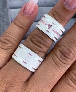 As Alianças de Namoro em Prata 950, com 10mm de largura, apresentam um design robusto e sofisticado com acabamento diamantado e 2 frisos laterais que realçam sua imponência. No modelo feminino, a peça se destaca com um coração vazado cravejado com 1 pedra de zircônia rosa no centro, complementado por 5 pedras de zircônia dispostas em cada lateral, totalizando 11 pedras, proporcionando um brilho romântico e marcante. O modelo masculino, por sua vez, apresenta um design liso com 2 frisos laterais, garantindo elegância e harmonia ao conjunto.