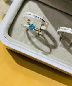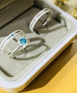 O acabamento totalmente diamantado com friso central traz sofisticação ao conjunto. A aliança feminina é adornada com uma pedra de zircônia azul cravada no centro do friso, garantindo um toque delicado e romântico. Já a aliança masculina mantém o visual diamantado com friso central, oferecendo equilíbrio e harmonia ao par.