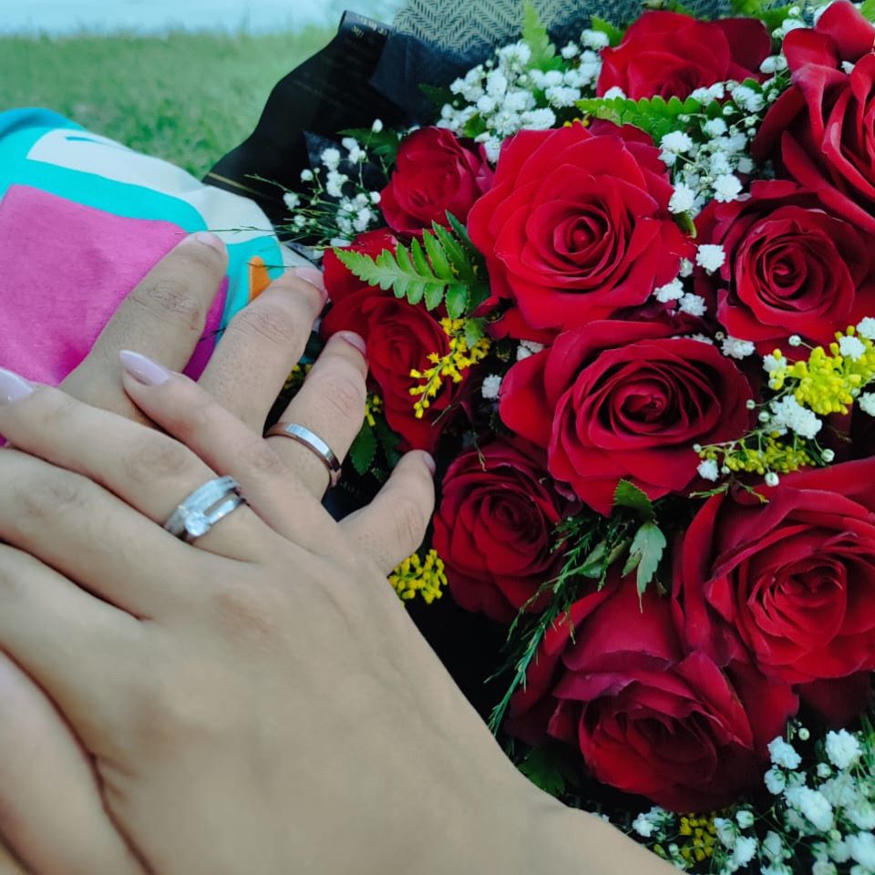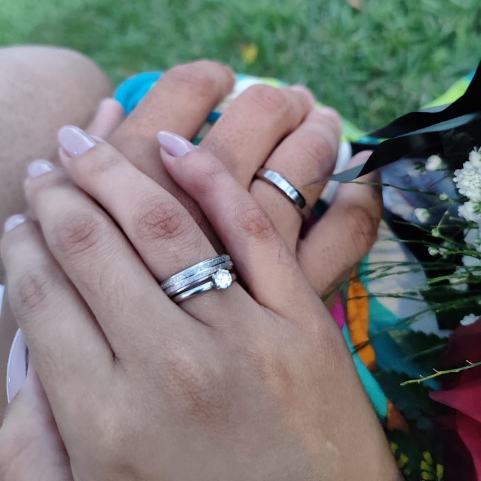 Par de Alianças Prata em Aço Cirúrgico 4mm | Feminina com 2 Frisos Diamantados | Masculina Lisa Chanfrada