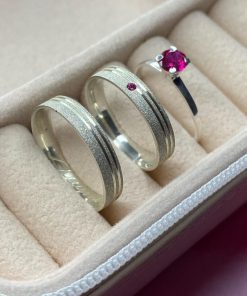 • Destaque Feminino: Aliança feminina com uma pedra de zircônia rosa, trazendo um toque de delicadeza e elegância.