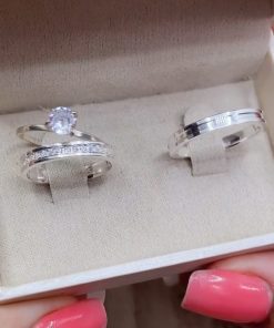 As Alianças Finas de Namoro em Prata 950 de 3mm trazem elegância e sofisticação. O modelo masculino é liso com um friso central largo, enquanto o feminino segue o mesmo modelo, mas com a adição de 15 pedras de zircônia no centro, dispostas em meia volta, que tornam a peça ainda mais especial. Para completar o conjunto, um anel solitário, complementa o visual, tornando as alianças ainda mais especiais.