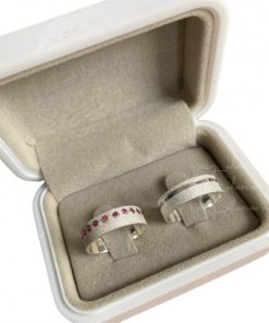 A aliança feminina se destaca pelas 15 pedras de zircônia rosa (meia volta), proporcionando brilho e um toque romântico à peça. O modelo masculino mantém o acabamento diamantado e conta com 1 friso lateral, conferindo um design equilibrado e sofisticado.