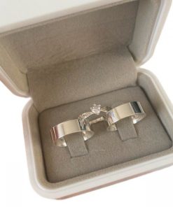 Esse modelo é perfeito para casais que desejam alianças elegantes, confortáveis e atemporais, com a opção de um anel solitário para complementar o conjunto.