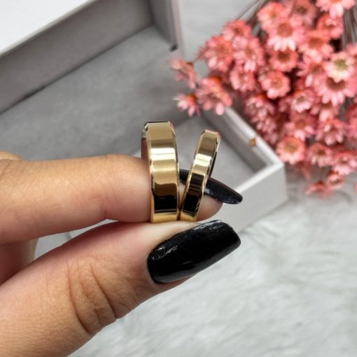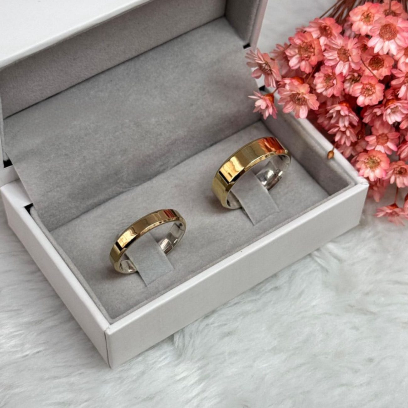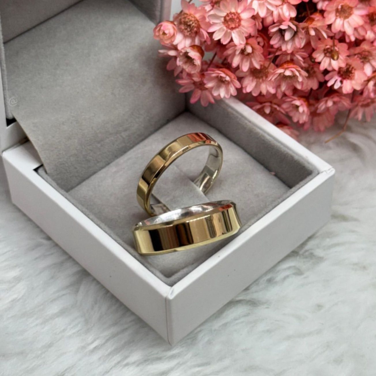 A aliança feminina é delicada com 4mm de largura, enquanto a masculina apresenta imponência com 6mm. Ambas possuem acabamento chanfrado e design liso, que reforça o visual clássico e moderno ao mesmo tempo.