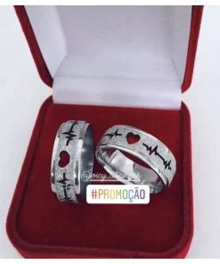 Par de alianças prata em aço cirúrgico 8mm diamantado c/coração ambos – Ideal para namoro, noivado e compromisso.