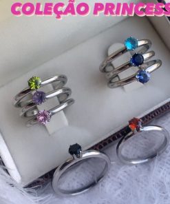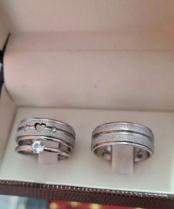 Trio de alianças prata em aço cirúrgico 8mm diamantado fem 2 pedras c/coração – Ideal para namoro, noivado e compromisso.